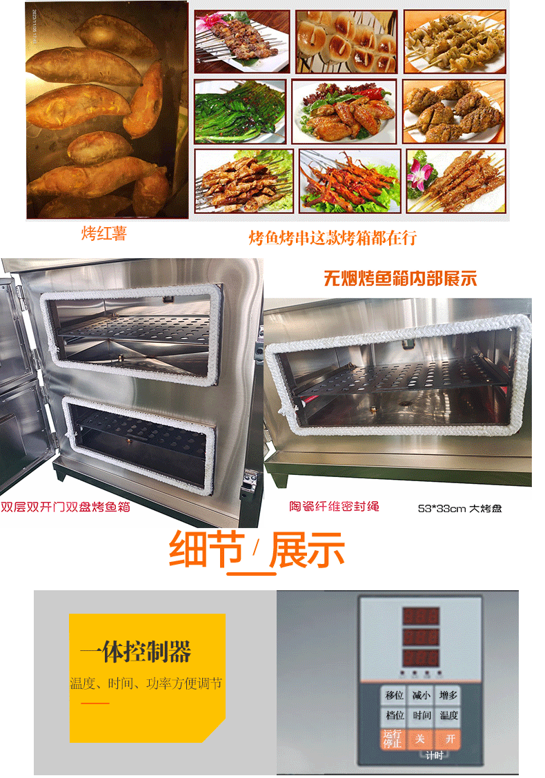 1.減少人工,320度恒溫烤制,避免人工操作的失誤,自動報警系統(tǒng),減少專門負(fù)責(zé)烤魚的操作人員/避免人為因素產(chǎn)生的烤制效果