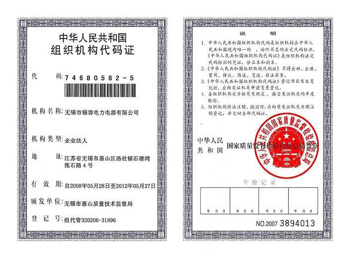 Organization code certificate release time:2020-07-20 04:35:16source:Wuxi Xirong Electric Appliance Co., Ltd.Click:2071
